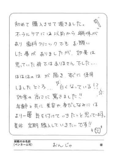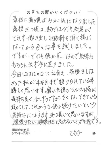 最初に歯の黄ばみが気にりなり出した高校生の頃は、自分では何も対策がとれず働き出しお給料を頂く様になってから色々な事を試しました。ですがどれも続かず…なので効果ももちろん出ず今に至りました。今回はははのはに出会え、長続きしなかった私が4本目まで続けられている事、嬉しく思います。磨いた後のツルツル感が気持ち良く、少しずつですが、白くなってきている気がして、これからも使い続けたいという気持ちになります。先は長いと思いますが、頑張りたい、頑張れると思えるハミガキ粉です。とも子 様